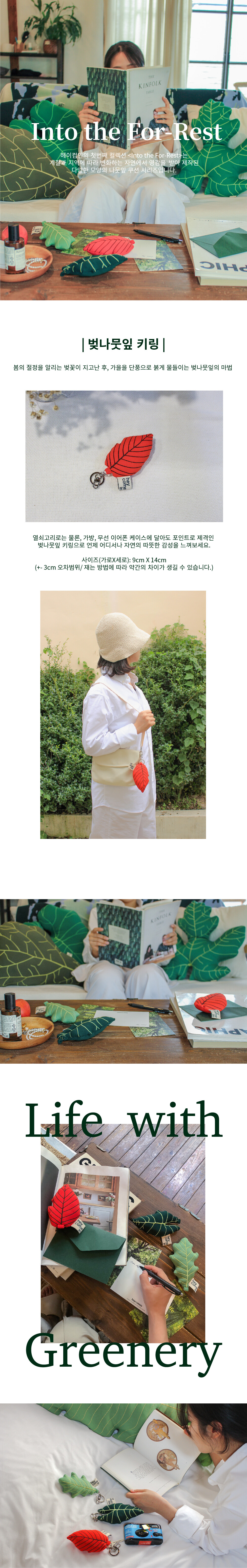 나뭇잎 쿠션과 키링 시리즈는 굴곡이 많은 봉제 제품입니다. 자수의 모양과 쿠션의 외각 모양이 이미지와 조금씩 상이 할 수 있습니다.